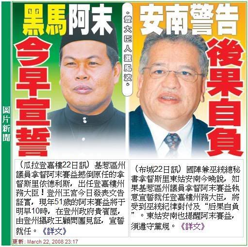 (布城22日訊)國陣兼巫統總秘書拿督斯里東姑安南今晚說,如果基惹區州議員拿督阿末賽益執意宣誓就任登嘉樓州務大臣,