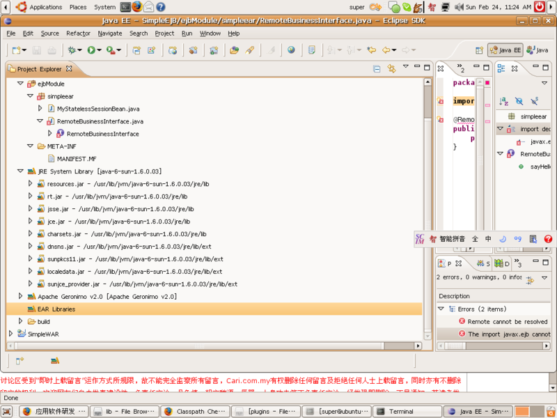 找到问题了, 新的JDK , javax.ejb package 在 javaee.jar 下, j2ee.jar 只是一个 dummy jar 用 classpath 设定,连接 javaee.jar 。 Eclipse 似乎不能连接, 所以直接加 javaee.jar 就解决问题了。 |