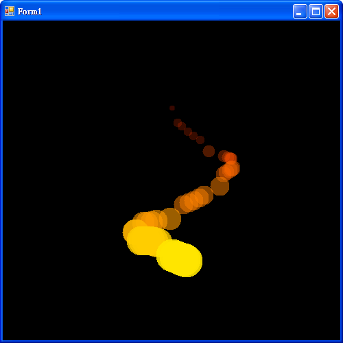 至于你的program无法显示。。。你是copy我的哪一个版本的source code? 如果是第一个版本(有华文注解的那个),在MouseMove event之后还有一个Timer event,你必须从 toolbox 里面 drag & drop 一个 timer tool,然后再如同 MouseMove event 那样从那个timer 的event list 里面创建你的 private void timer1_Tick(object sender, EventArgs e),而不是直接 copy & paste,不然 C# 的 Manager 并不知道那个function 是对应 Timer 的。这是 Managed code 的一点小麻烦。既然 Manager 并没有把那个 function 和 timer event 挂钩,自然就没有进入粒子更新和描绘程序了。 |