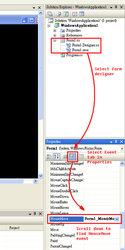 在 Visual C# 里面,要使用Form的event,你可以先在 Solution Explorer (通常在当你开启了一个windows application 的 project 之后,会出现在画面右方)选择了你的program (在这个例子里面是 Form1.cs),然后点滑鼠右键,选择view designer,就会显示 Form 的设计界面,选择Form,点右键选择 property,solution explorer 底下就会显示 Form 的 property,在property的视窗里面的上端有一个toolbar,有一系列的button,当中第4个,呈现一个闪电状的图案的,就是Event List了,你可以在里面找到所有跟Form有关的Event。对任何一个Event的右边的空白格子double click就会开启一个空的event handler,你可以在里面输入任何你想在该event 发生时想要做的事情。