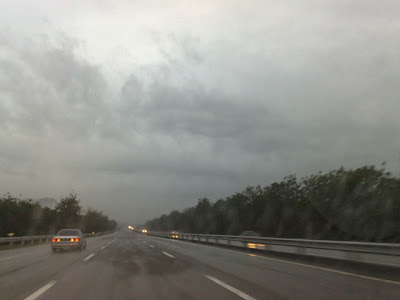 我真的很困,一上车就睡了... 不到一個小時后,當我醒來時,天开始亮了,但它正在下雨: