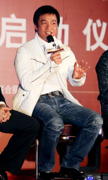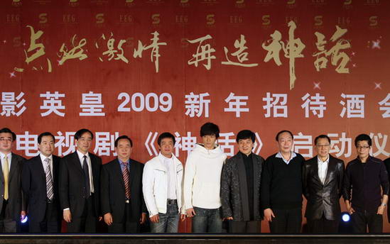 2009年1月5日,由上影英皇巨资投拍的35集大型电视连续剧《神话》在北京举行了盛大的启动仪式,成龙、导演唐季礼、英皇集团老板杨受成、上影集团总裁任仲伦等出席,共同揭开了电视剧《神话》的神秘面纱。 成龙接受主持人采访 成龙赠胡歌“神话”盔甲 主创人员大合影 成龙转战幕后 首次担任电视剧总监制