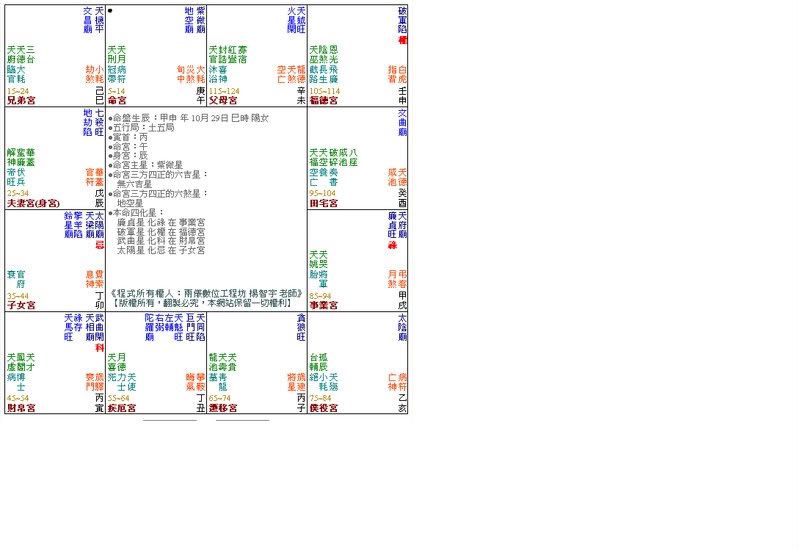 为什么你们这么相信书?我们是从多看,多算,case study中得到结果,若皇帝独坐就称孤君,那要三方来干嘛? 百官供照,或吉星相扶都有影响,怎能说是孤君呢? 论疾厄就一定要看疾厄吗?巨门天同不是指嘴巴裂,而是指血压,精神问题及头部问题,这些都是经验,不是全照书的,书或口诀只能做参考,那你能了解祖师爷陈希夷所说的:“不依五星要过节”,是否说不需要依照五星的算法要过节气呢?还是说"不依五星,要过节“ 呢 ?你对所谓的口诀了解又有多少? |