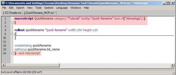 (三)macroscript 1)这个步骤将我们的script转换成macroscript(如下图所示),以载入到Customize User Interface内,方便设置shortcut key或将其变成toolbar item。- macroScript QuickRename category:"Tutorial" tooltip:"Quick Rename" Icon:#("AtmosApp",1)