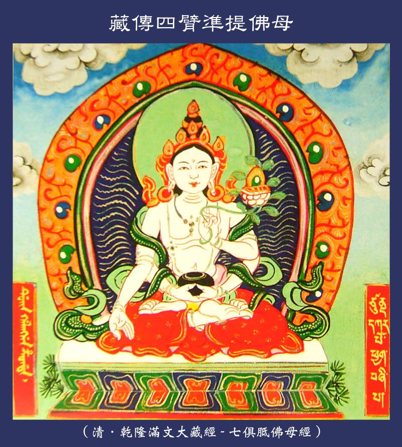 汉译有准提观音、准提佛母、七俱胝佛母等名。是以准提咒著称的大菩萨。禅宗以为观音部的一尊,称之为天人丈夫观音。准提汉译为清净,赞叹心性清净之称,东密以为六观音之一,现三目十八臂形像。