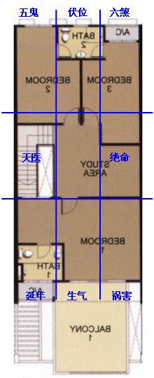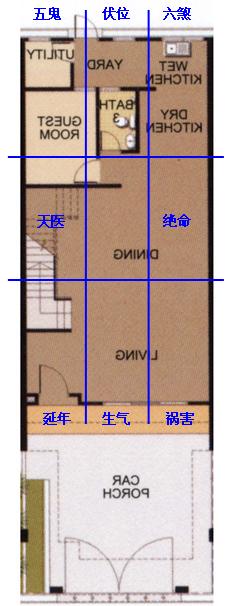 以上两点并不理想。方法是,你可以考虑使用生气位上的sliding door,或是请风水师替你调度一下比较好。除此你可以把厨房内移到伏位,或外移到天医位,尽量避开五鬼位。至于你的主卧房,正好落在吉位上,所以没问题。
