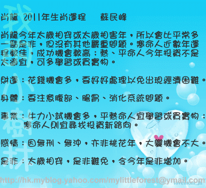 三月:(壬辰)5/4/11—5/5/11 兔年的第三个月,属龙人的运势继续下降,工作方面有不少阻碍,对事业发展很不利,应尽心努力,以免事业陷于停滞,同时也要提防有人在背后搞小动作。财运反复,正财及偏财均不宜憧憬,尤其在处理公司账目上的文件时,要细心审核,防止因账目出错引起损财。健康需小心保养,注意身体护理,少吃煎炸食物,养成健康饮食的好习惯。感情运极佳,有机会邂逅动人异性,应多花些心力培养感情。