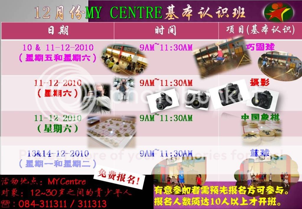其实,巧固球运动已在西马推广一段时间了。对于砂拉越和沙巴来说,巧固球还是一种新运动。MY Centre想藉此机会把巧固球引近诗巫的各中学、学院甚至是小学。然后,再推广到砂拉越各省份。其目的是让青少年多了一种球类运动选择。除此之外,想藉此运动来培育青少年们的品格跟团队精神,全面发展青少年人的生命。 想要了解篮球的起源吗?是谁发明了篮球?为何要发明篮球?想要了解更进一步了解篮球请报名参加由MY Centre所举办的篮球基本认识班吧! 开班时间表如下: 10 和 11-12-2010 | 星期五和星期六 | 9AM至11:30AM | 巧固球基本认识 | 11-12-2010 | 星期六 | 9AM至11:30AM | 摄影基本认识 | 11-12-2010 | 星期六 | 9AM至11:30AM | 中国象棋基本认识 | 13和14-12-2010 | 星期一和星期二 | 9AM至11:30AM | 篮球基本认识 |