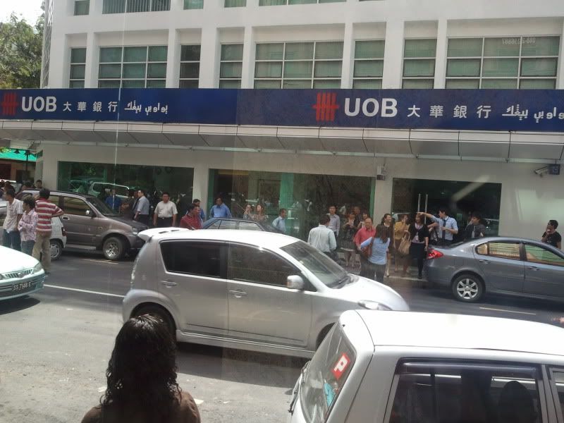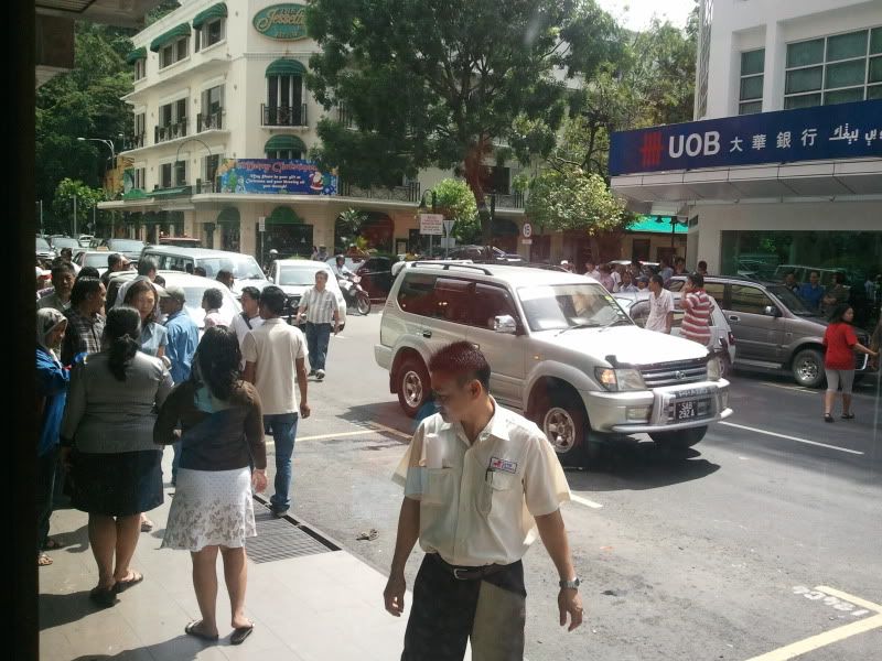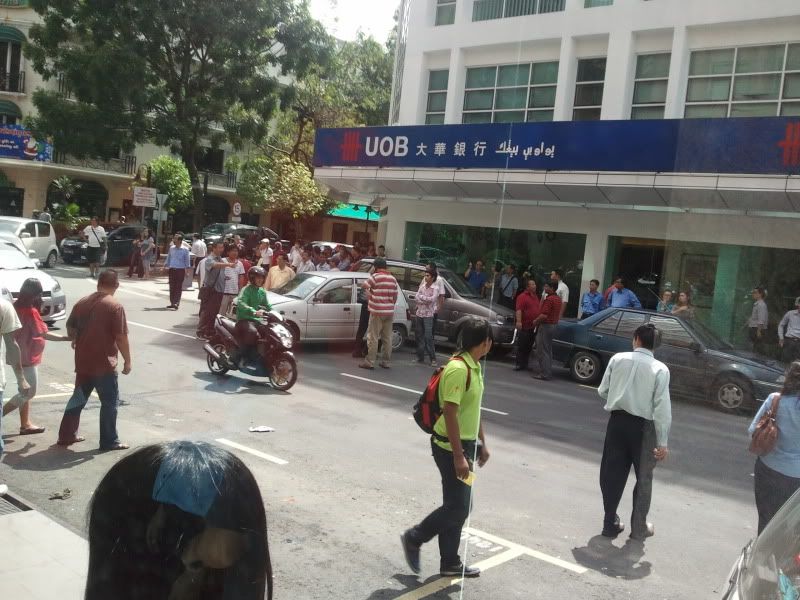 中午时分的亚庇市区虽然不是星期日,尽然人山人海,大家收到风后都从办公室涌了出来. 可见大家的生活都是那么的闷,大家都在第一时间出来八卦八卦来增加生活的情趣. 据说(肯定不准)驾驶者为华裔, 不知何故自老虎牌银行方向冲过来撞了第一辆车后就冲着大东方楼(反方向)方向飞过来, 冲上人行道后再后退, 后退后再转去富源(顺方向)刚好再撞中一辆Vigo. 一路撞着来总共7辆车,包挂那辆启事车辆. 其实还有一辆泊在人行道的Kelisa也是遭殃,不过主人应该走远了不懂不幸已经降临了他的身上.一时之间街道两旁好像炸开了锅那样,无数的八卦好事者都站完出来,情形好不热闹啊~!!!