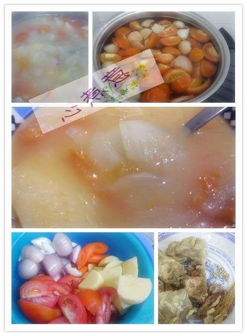 材料:猪尾骨1斤,鱿鱼干1条,番茄6颗,马铃薯4粒,大洋葱5粒,红萝卜2条,白胡椒随意
