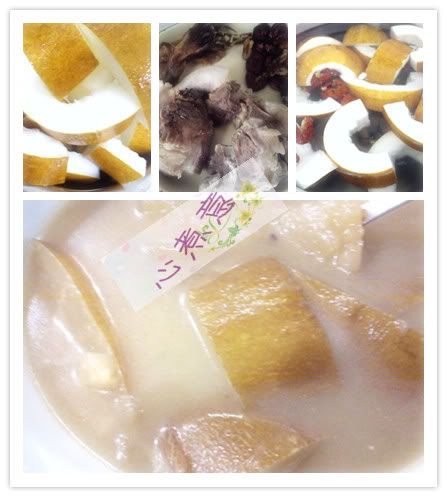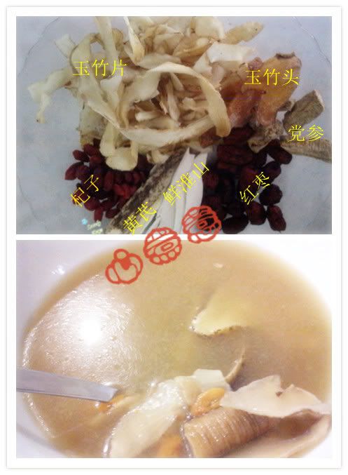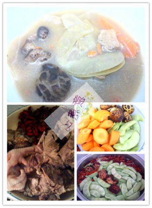 材料:猪尾骨1斤,鱿鱼干1条,鸡脚1双,冬菇6枚,红萝卜2条,红枣去核15粒,杞子1汤匙,豆豆RM1