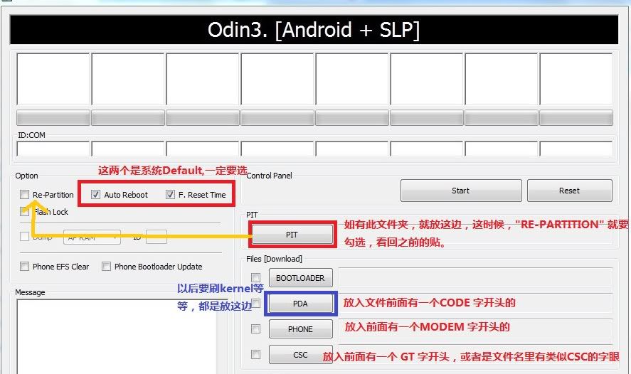 3c. ROM包里如果只有单一 PDA.tar 文件刷机方法:Re-Partition前不打勾 不选PIT
