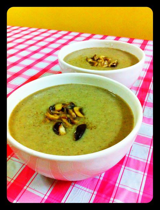 之后再分几批, 分次倒进搅拌机里拌碎, 之后再回锅加热, 放CREAM , 起锅前撒点黑胡椒粉, 就可以盛碗了。 上面再放之前预留的金黄白菇和洋菇做点缀。 完成!!