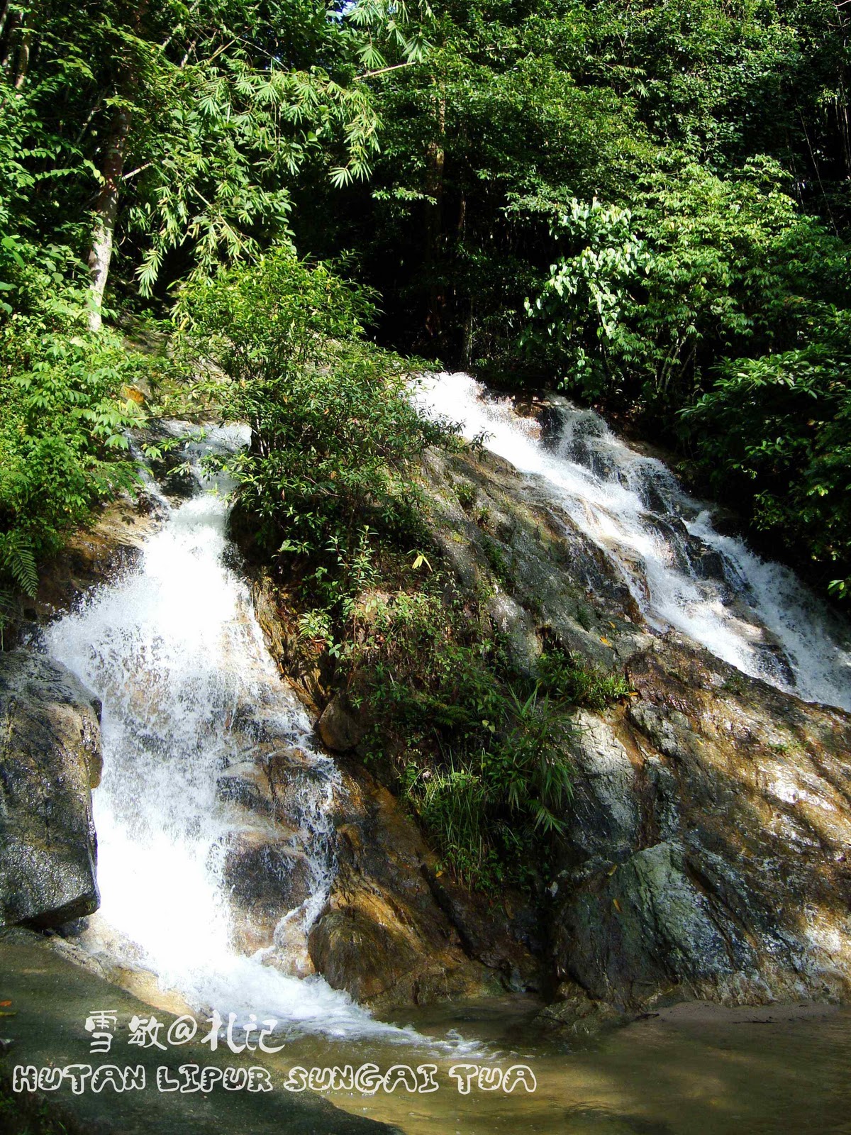 跟着箭头走,过了吊桥,就会看到一大片分割好的空地,主要是用作露营~~~ 在这里逛了30分钟左右,发现原来没有瀑布,瀑布还得驾车再上一点。我们就走回车驾车再直上,一段很短的距离我们就看到了左手边有一个瀑布,就在马路旁边而已~~~这个就是今天的目的地,Sungai Tua Falls