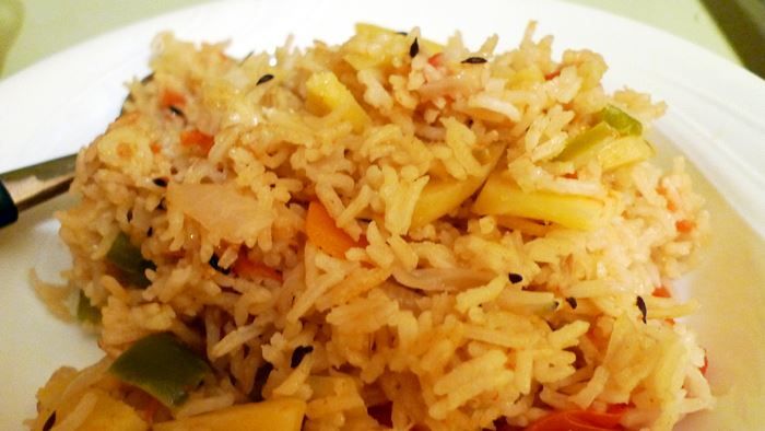 1. 爆香cumin seed,加入蒜米洋葱,再慢慢加入其他菜和番茄,加点cayenne pepper添加辣味,一茶匙盐和糖,加入一杯米翻炒。