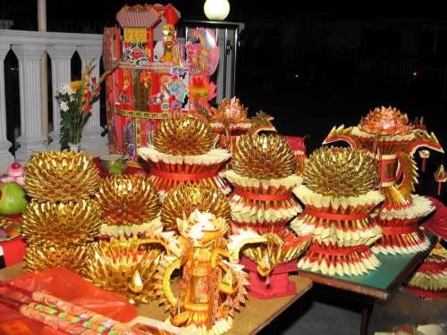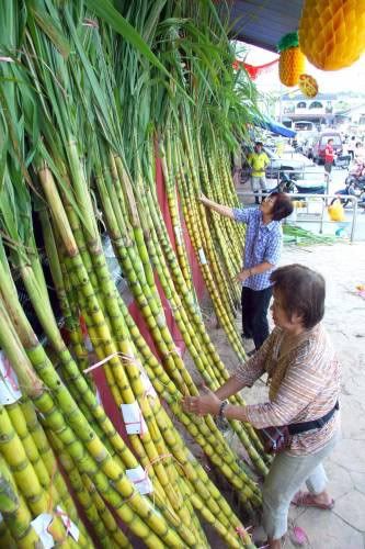 讲究仪式的家庭,会在户外或在户内院子里选择一处没有遮拦、可以直对天际的空间,用两张桌子重叠成高坛,又在两侧各放一枝甘蔗,以便朝望天空祭神。祭神的甘蔗须带叶,以征节节上升甜节节和开枝散叶。 |