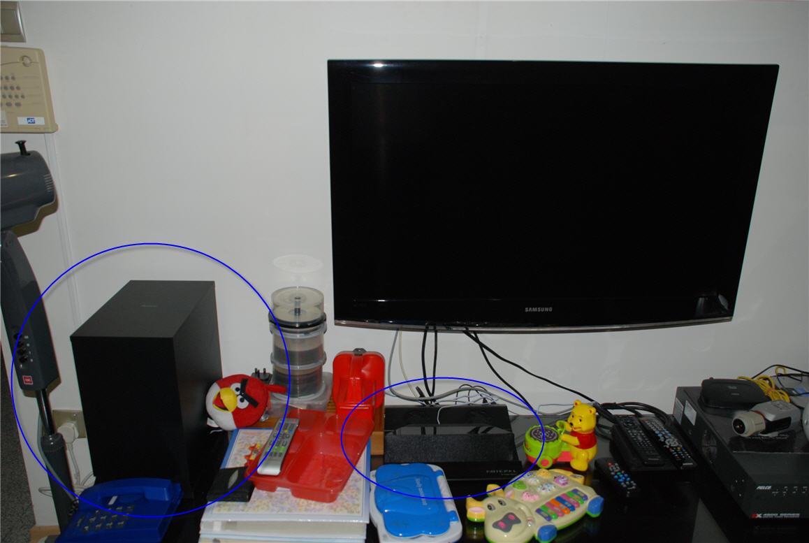看来看去,还找不到你中央的那个speaker,是放到电视机后面?