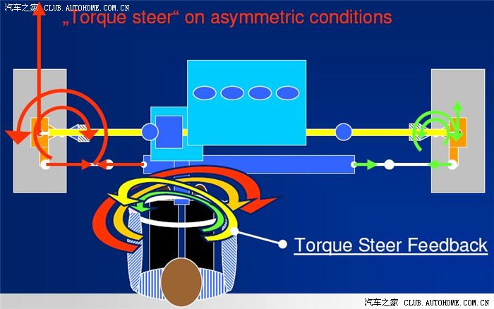 torque steer按字面翻译就是扭力转向,实际是“加速跑偏”,通常是'大功率/大扭力前驱车'的通病,因为FF车的传动轴需要负责转向及动力传递,而又因为变速箱位置的关系,左右传动轴常有一根长一根短的设计,当忽然有较大的扭矩从变速箱动力输出轴输出到左右两根传动轴时,就会因为力矩不同而造成车辆行进方向的跑偏,这就是所谓的扭力转向(加速跑偏)。