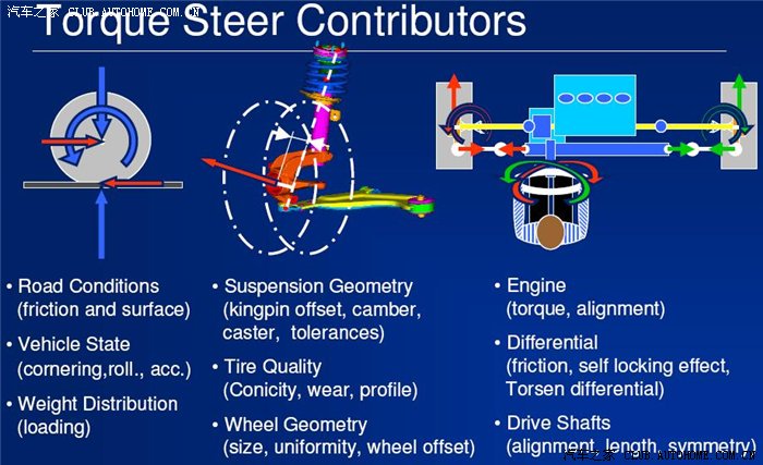 2)悬挂设计(几何结构例如外倾角camber,麦弗逊式前悬挂就很容易出现torque steer);