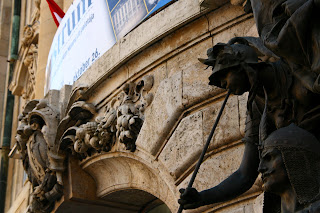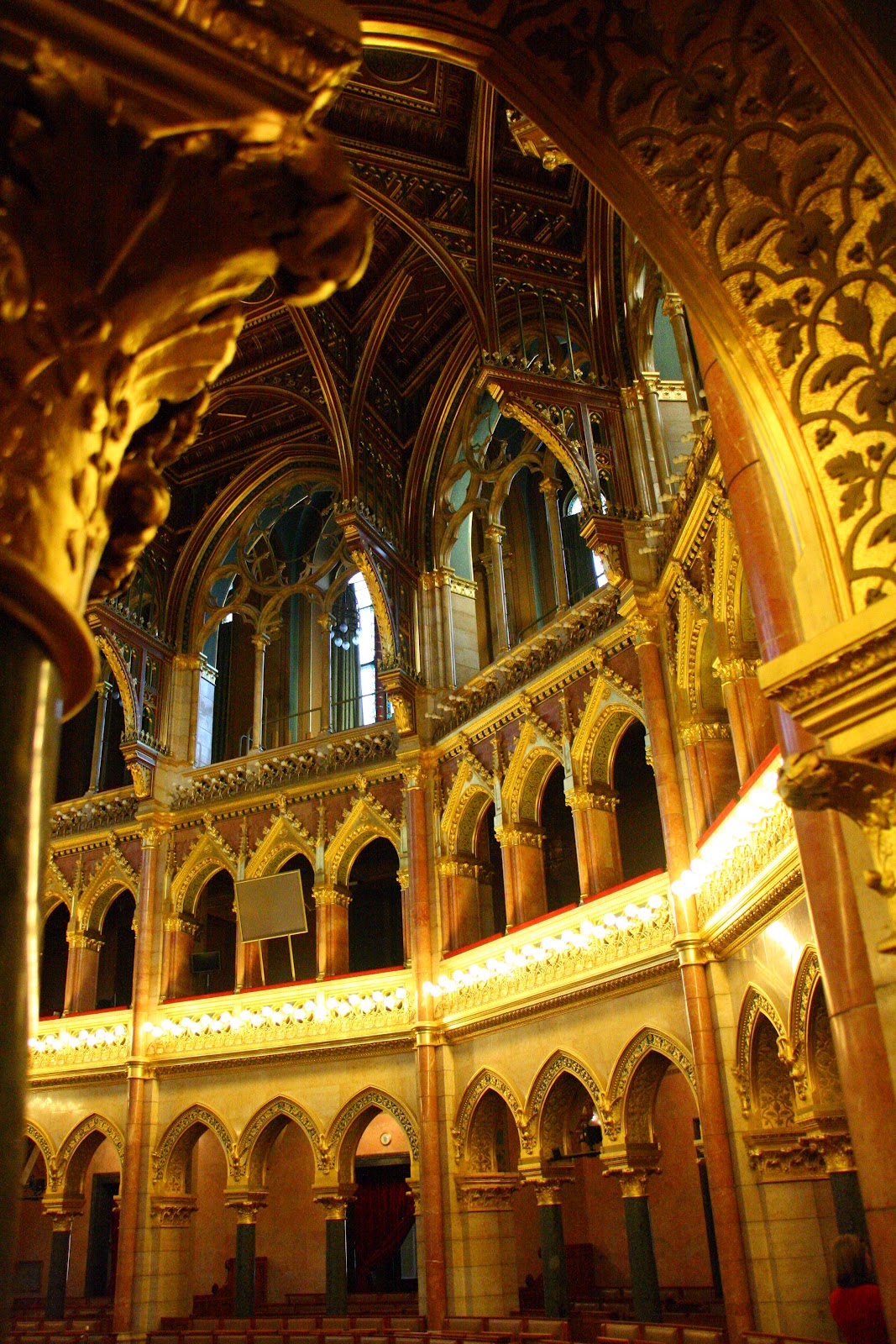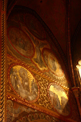 我们从前方一道侧门进入教堂里边,几缕阳光透过高大的彩窗,在大殿里洒下暖暖的光芒,为略为阴暗的大殿带来一股神圣庄严的气息。当眼睛经过了一段短暂的适应之后,这才清楚发现教堂内部的华丽程度堪比皇宫内院,尽显辉煌富丽景象,那些表面光滑的巨大深色大理石柱子,雕工精细的大理石浮雕,色彩斑斓的精美壁画与及绚烂的彩绘玻璃,简直美不言喻!穹顶华丽精美的镶嵌画记载了匈牙利第一任国王依斯特万(圣史蒂芬)的生平记事与及圣经里所记载的故事。阳光透过穹顶上的窗口倾泻下来,犹如天堂之光那般沐浴着竖立在大主坛正中央的圣史蒂芬大理石雕像,为大主坛增添一股神圣庄严的气息。位于主坛后方的礼拜堂内存放着一只木乃伊状的右手,经过考古验证,这就是圣史蒂芬的右手,是这里最为神圣的物件。还以为有机会可以一览实物,没想到我们只能从远处观望一只精美华丽的黄金盒子而已,根本就没法一睹收藏在黄金盒内的圣物。