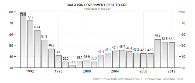 Malaysia Government Debt To GDPMalaysia recorded a Government Debt to GDP of 52.60 percent of the country's Gross Domestic Product in 2011. Historically, from 1990 until 2011, Malaysia Government Debt To GDP averaged 47.39 Percent reaching an all time high of 79.50 Percent in December of 1990 and a record low of 31.80 Percent in December of 1997. Generally, Government debt as a percent of GDP is used by investors to measure a country ability to make future payments on its debt, thus affecting the country borrowing costs and government bond yields. This page includes a chart with historical data for Malaysia Government Debt To GDP.