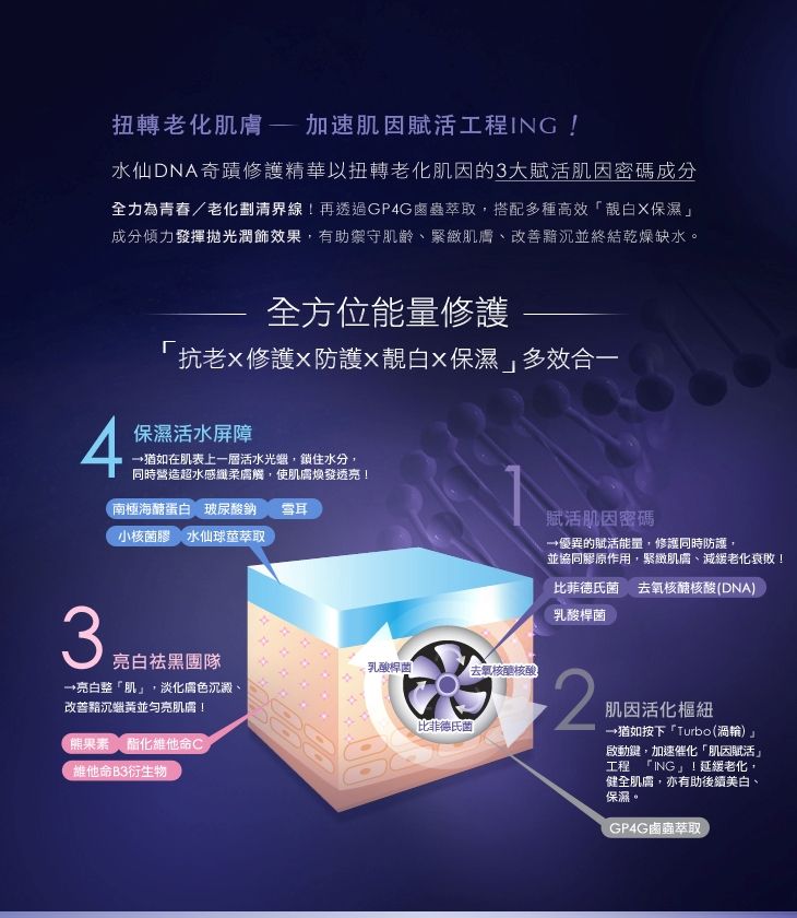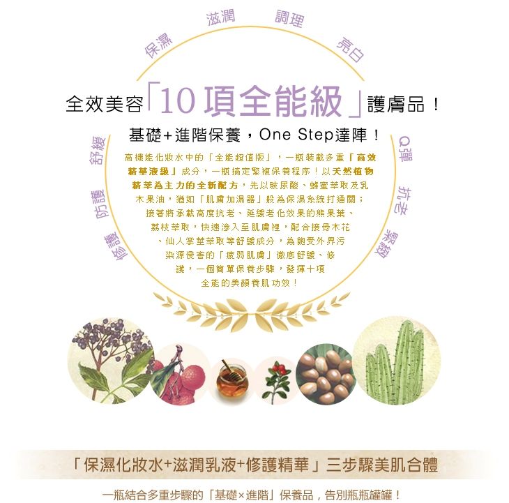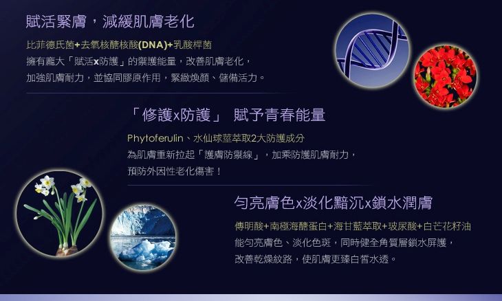 緊緻、拉提、美白、保濕、修護、舒緩、抗氧化,