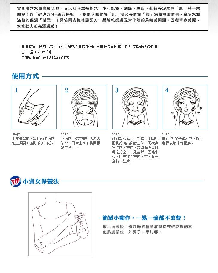 3. 肌肤敏感者,使用前请先做少量试用,完全无刺激反应,再使用。