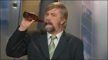 威斯卡拿起啤酒正准备喝时,发现镜头在拍他,马上放下酒瓶若无其事继续播报新闻。(图片截自芬兰电视台)