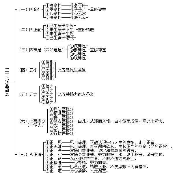 2. 三十七菩提分法共分七类:四念处、四正勤、四如意足、五根、五力、七觉支、八正道。要想完成三十七道品,必须从四念处开始,然后经过四正勤,依此类推,一个段落一个段落的完成之后,才能够得解脱道而证涅槃。
