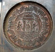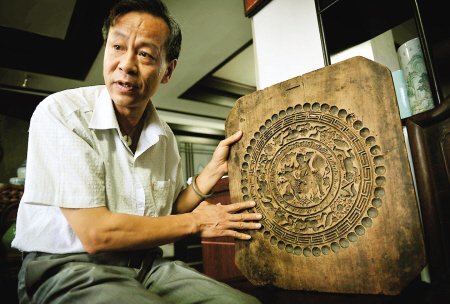 中國安徽展出歷代月餅模具,圖為清朝「龍鳳呈祥」木製模具。中新社
