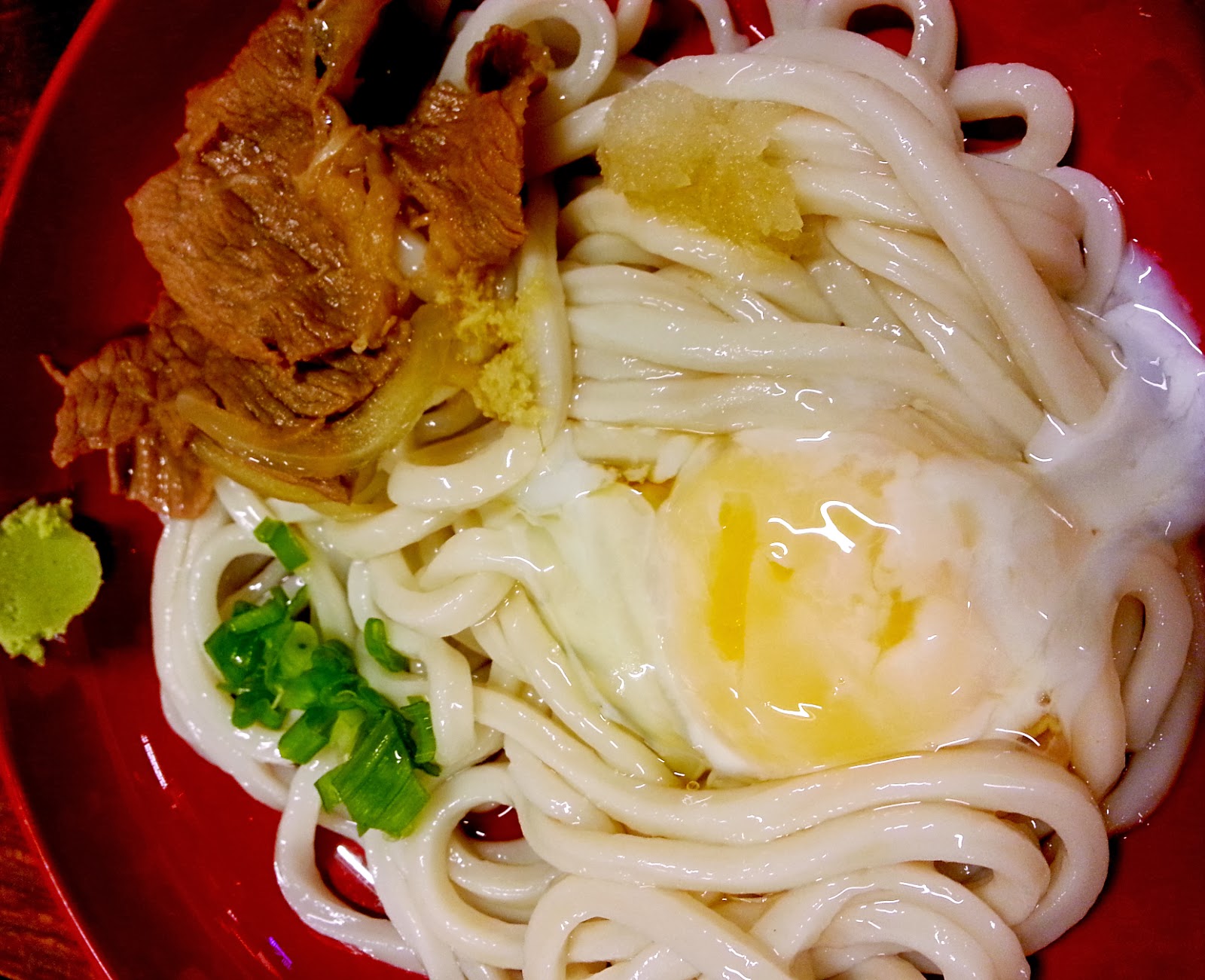 牛肉乌冬是干的,配料很是简单,几片牛肉加一个蛋和一小坨白箩卜泥,拌后吃第一口时就觉得味道好淡哦!!老吴狂往面里加七味粉,我心想要加那么多粉的东西还好吃吗?还吃得出原来的味道吗?><