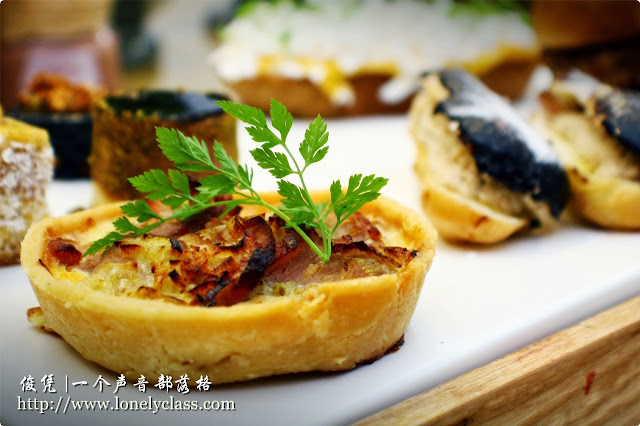这些可爱的小蛋糕正争奇斗艳,每一个都有独自的风味,各自精彩,每一块都是那么好吃。不过,我个人特别推荐巧克力圆形蛋糕,Chocolate Truffle with Pistachio,蛋糕内散发出开心果的香气,而巧克力酱则非常浓郁,甜美无比,真是甜入心坎,太好吃了!另外,还有一个烟熏鸭肉的quiche, 咀嚼几口,口中即弥漫着烟熏的香气。