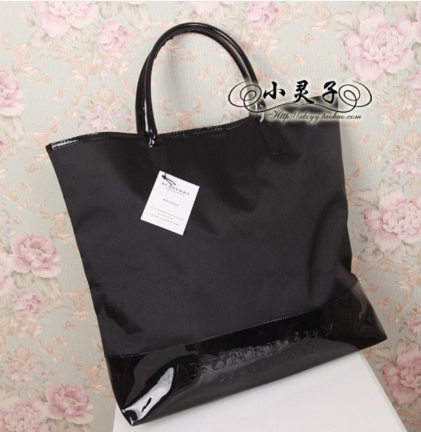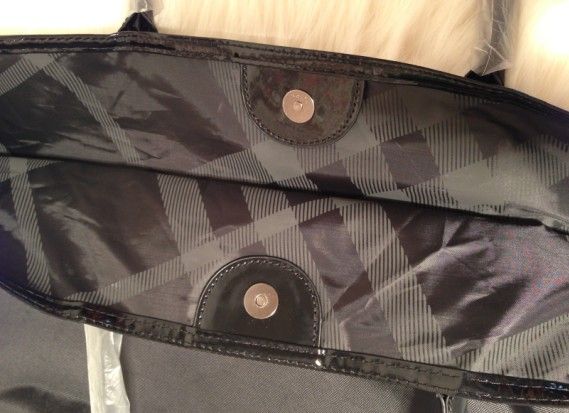包包容量比较大 上半部分是尼龙布材质 下半部分是亮漆皮PU材质 ; 内衬是B家经典的格纹图案 非常有档次的一个化妆包