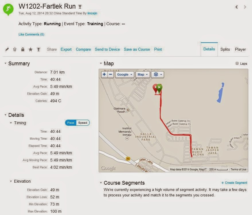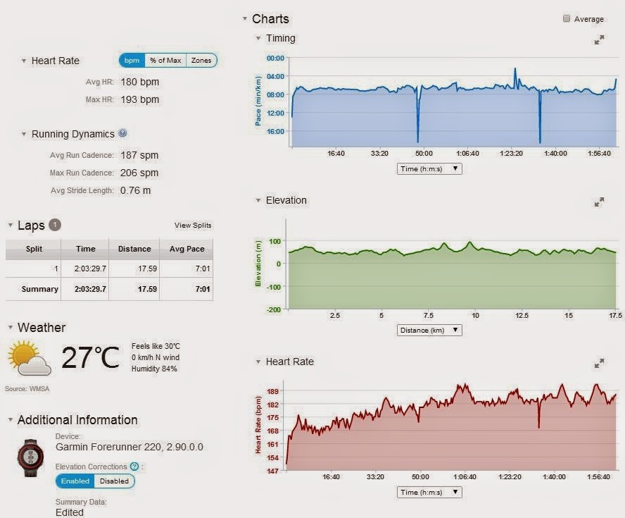 从起跑到5公里处,心跳都保持这169左右,手表的警示一直提醒着自己。渐渐地跑过8-9公里的上下坡后,心跳都维持在180左右,而这也是整个赛事的平均心跳。前面9公里必需感谢Gavin Yong的陪跑,没有他我可能就会用更慢的速度跑而不能达标(这时候要达成目标2已经不可能,转而专注在目标3)。
