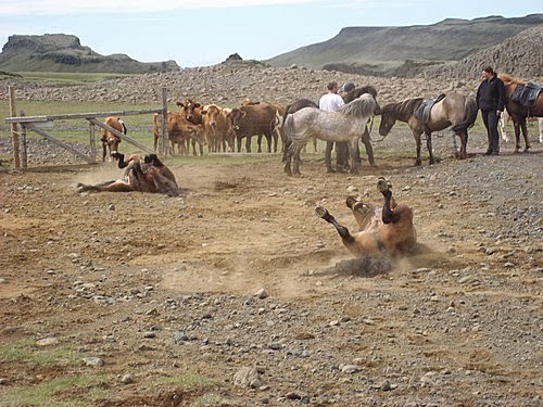 这里的马圈很小, 二十多只马加上我们十多人在马圈内, 工作人员圈马时, 马儿反应大了跑起来, 其他马跟着一块跑, 沙尘飞扬, 加上大黑尽责地履行牧羊犬的天职, 跑来跑去帮忙赶着马儿往一边, 场面也很哄动. 我们夹在马圈内, 已贴着马栏站, 可说是退无可退, 如果马儿向着我们跑也很危险. 工作人员们如是这般圈了几只马, Vilborg才醒觉不应也不需要让我们站在马圈里面, 就让我们到马圈外空地等.
