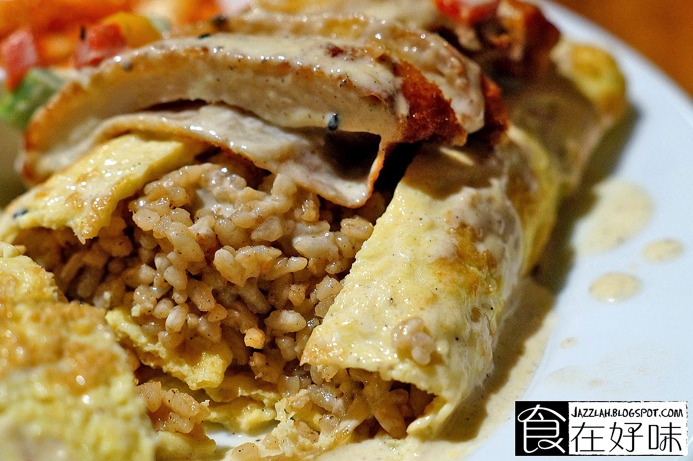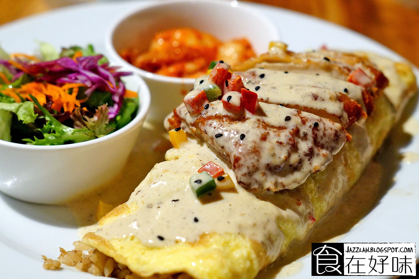 其实这道蛋包饭实在看不出哪里源自韩国风味,原本以为蛋内的炒饭是Kimchi炒饭