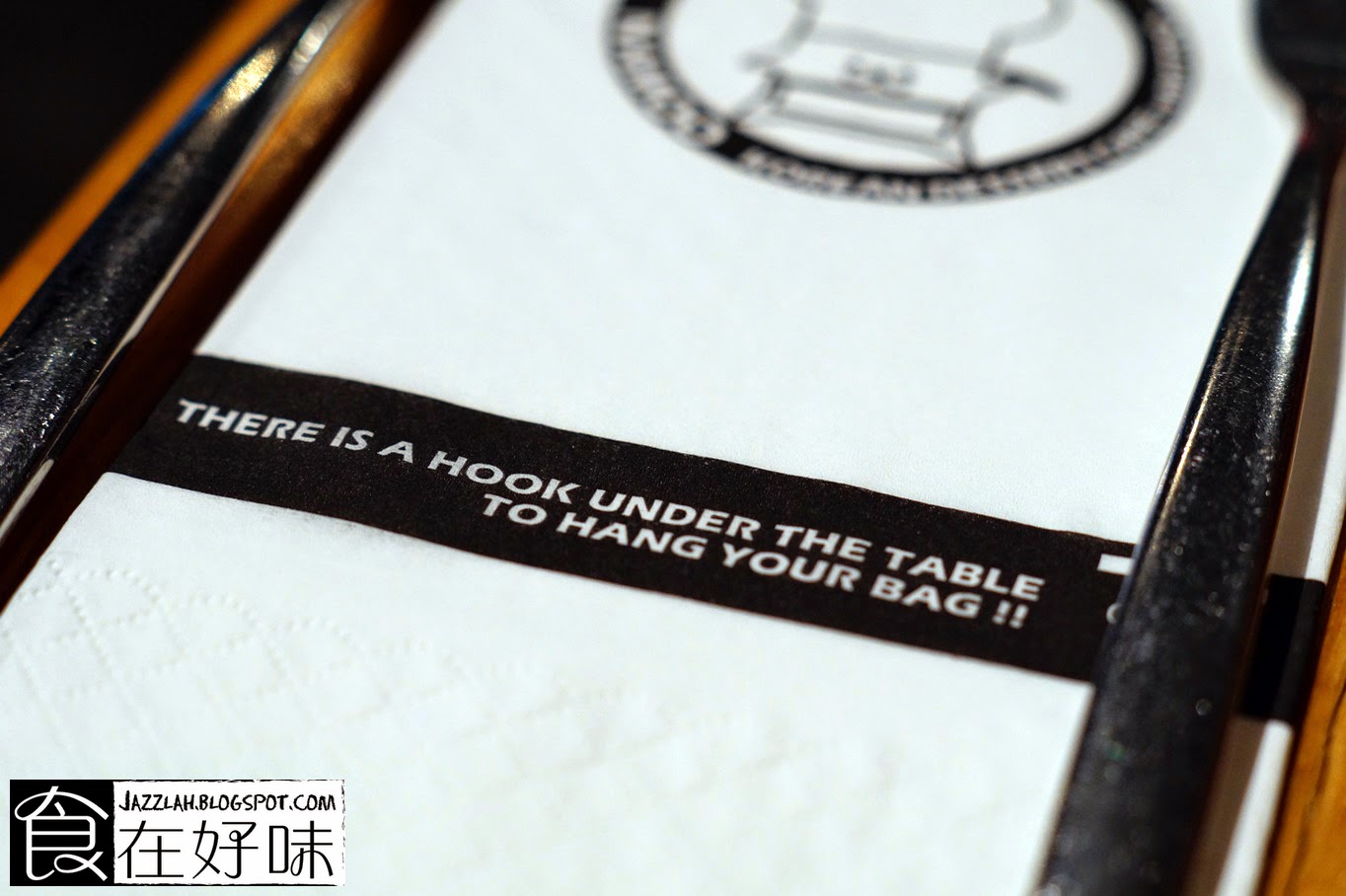 仔细留意的话可以发现餐巾上有注明餐桌下有一个挂钩,可以挂上包包,非常贴心的设计