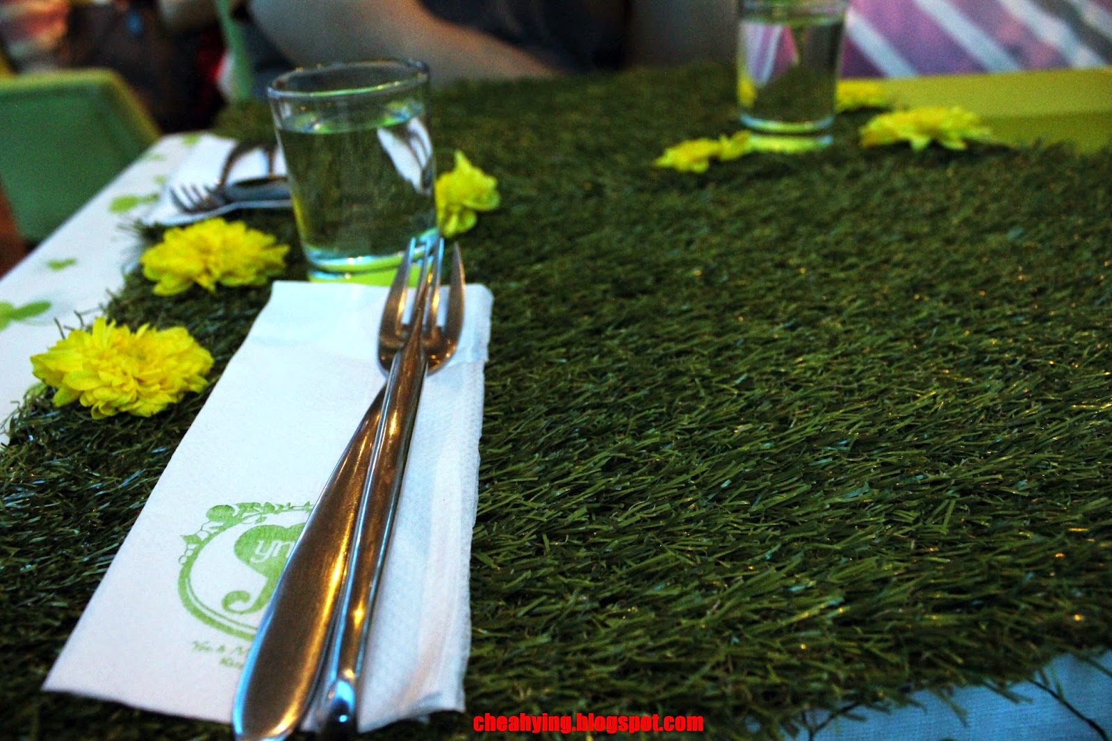 点餐后,服务员会送上一杯清水,给你一份假草,草上方的都是真花哦。。。