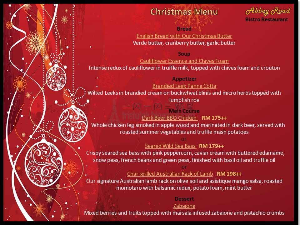 圣诞节来了,2015年也不远了 很多人都会趁着年尾花红拿了都要大肆庆祝一番 很多情侣们也要找个地方庆祝这温馨日子 正好搜集了部分餐厅和酒店的圣诞节套餐和Buffet 方便大家预览~ (注:New Year Eve可以参考翔翔的部落格: Heaven's Gate Christmas Set Dinner 价格:RM128+/person ; RM138+/person ; RM158+/person 时间: 1st session = 6.45pm to 8.45pm 2nd session = 9.00pm to 11.00pm 地址:1A, Lebuh King, Georgetown, 10200 Penang 联络号码:012-488 5979 备注:预订时必须付RM100 Deposit,更多详情参考这里 Eld's 22 Pasta & Grill Christmas Set Menu 24-25 Dec & 31 Dec | RM39.80+ (book before 23-Dec receive 5% discount & Christmas Gift) Add: 163D-Level 5-16, 18 & 19, Gurney Paragon Mall, Persiaran Gurney, Pulau Pinang Tel: 04-218 9013 Abbey Road Bistro Restaurant Christmas Menu Price: RM175+/pax ; RM179+/pax ; RM198+/pax Add: 6gf, Lebuh Tenggiri 2, Pusat Bandar Sunway, 13700 Seberang Jaya,Penang. Soul Cafe Christmas 4 Course Dinner 23-Dec | 6PM - 11PM | RM98nett/person ; RM128nett/person(free flow red wine) 地址:12, Jalan Kek Chuan, 10400 George Town, Penang. 联络号码:04-226 8200 (24-Dec已經Fully Book)