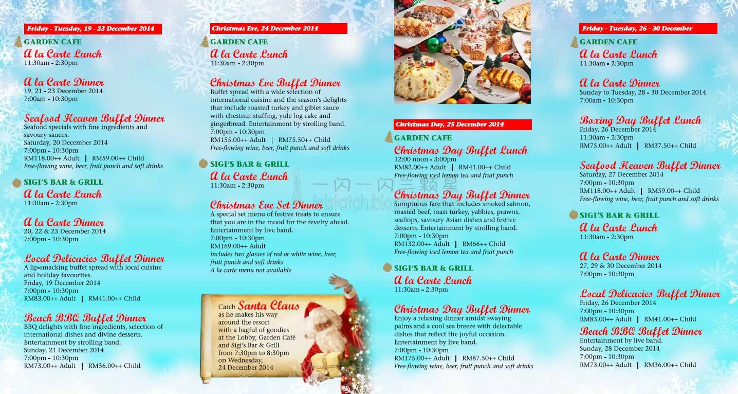 Feringgi Grill Boxing Day Set Menu | 630PM - 1030PM | RM195+/person Spice Market Boxing Day Brunch# | 12PM - 3PM | RM148+(adult);RM74+(child) # Includes Free Flow house wine, Beer & Soft Drinks Spice Market Seafood Buffet Dinner | 630PM - 1030PM | RM158+(adult);RM79+(child) Pinang Restaurant & Bar BBQ Buffet Dinner| 630PM - 1030PM | RM118+(adult);RM59+(child) 地址:Batu Feringgi Beach, 11100 Penang. 联络号码:04-888 8888 Golden Sands Resort 24-Dec 2014 Christmas Eve Garden Cafe Christmas Eve Buffet Dinner# | 7PM - 1030PM | RM155+(adult);RM75.50+(child) #Include free flow of wine, fruit punch, beer & soft drinks. Sigi's Bar & Grill Christmas Eve Dinner# | 7PM - 1030PM | RM169+/person #Include 2 glass of wine, fruit punch, beer or soft drinks.