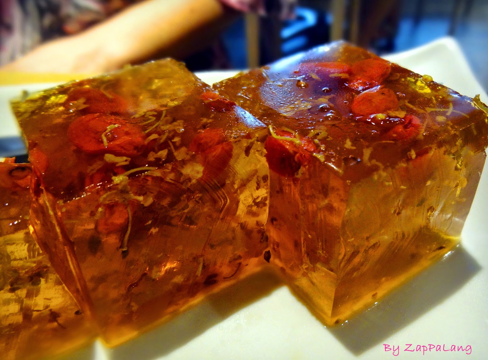 枸杞桂花糕是常常出现在宫廷剧里的甜点,看到它就让我觉得自己是娘娘了!第一次吃枸杞桂花糕,感觉冰冰凉凉的,带有淡淡的药材和花香味,香香甜甜,口感跟燕菜很像。据说枸杞有滋养、强壮和降血压的疗效,桂花则可以生津、化痰止咳,是非常养生的甜点哦!