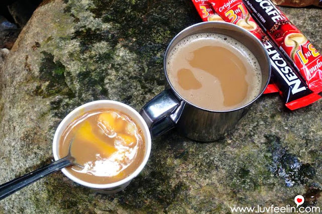 下山的时候因为有泥泞的关系会比较滑,幸好有带上登山杖,让下山路变得轻松一些。大约一个半小时就抵达了瀑布,大伙儿已经在那儿候着了!眼见全体队员人齐了,跳水王子 Jun Chin 就开始煮水,准备弄他拿手的咖啡加蛋,特别顺滑可口哦!而我们则迫不及待的就跳下水去,一洗之前的疲累,顿时觉得清爽多了!
