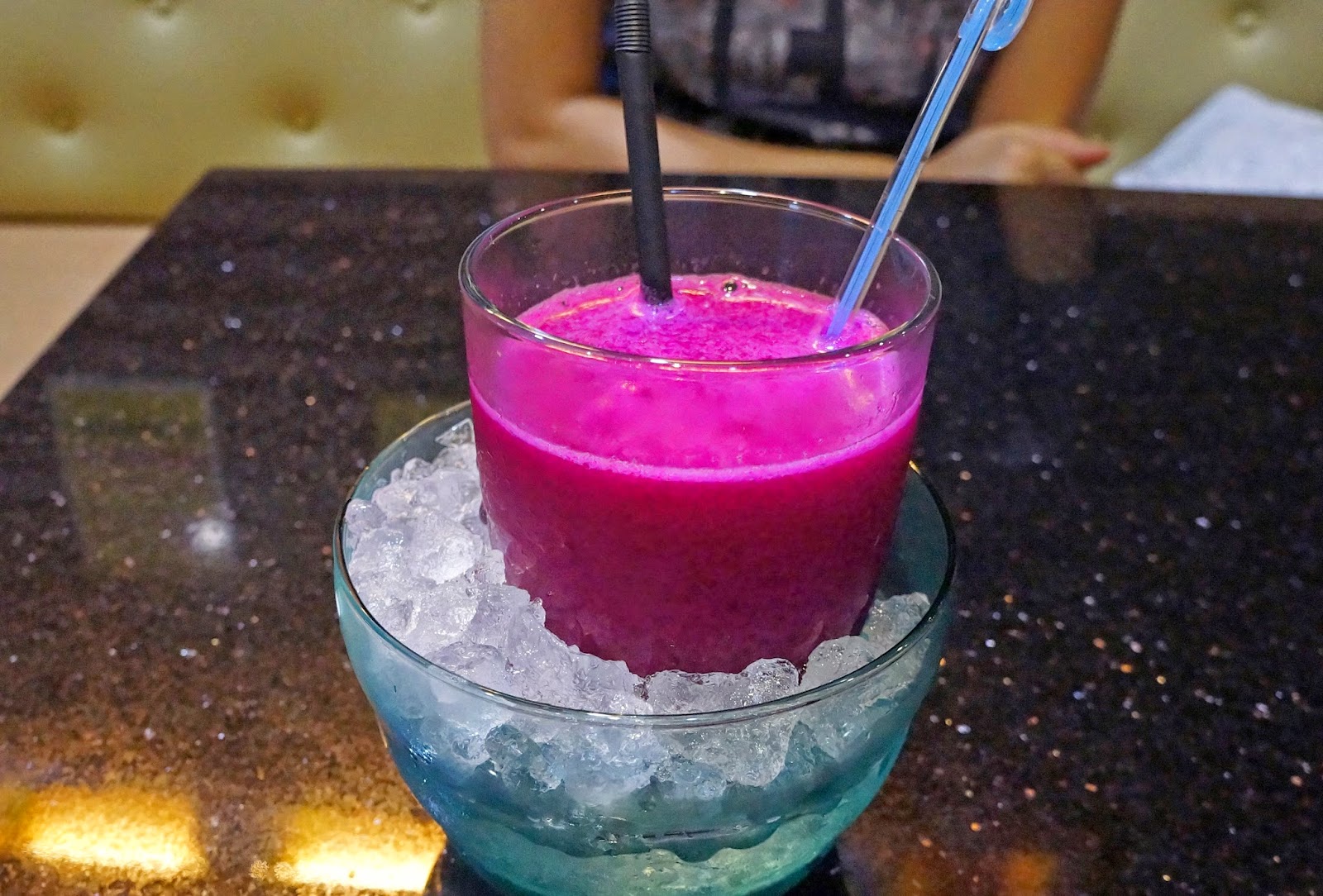 为了不让融化的冰块稀释了果汁,店家很体贴的把果汁杯放在一个装了冰块的碗里。火龙果果汁味道浓郁天然,还能够喝到火龙果本身“稠稠”的口感,很不错。