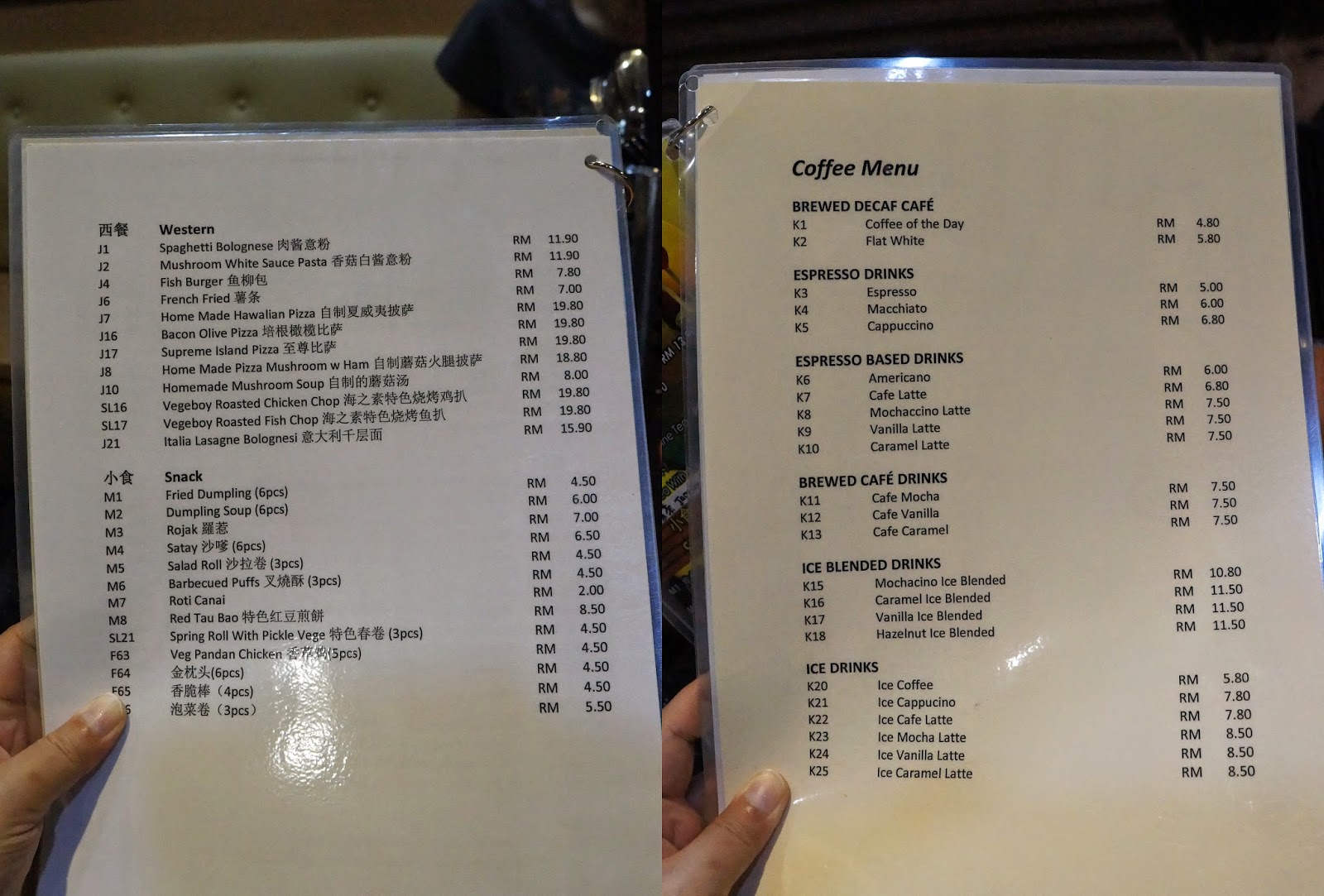 除了中餐,也有各式西餐与小吃共选择;咖啡Menu选择很丰富哦;除了Kimosasa,在沙登附近也找得到素食西餐了。