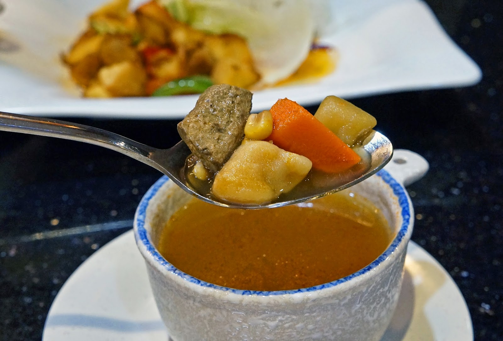 这汤一入口就让我眼睛发亮,太好喝了。以蔬菜煲出的汤有着天然的甜鲜味,里面也有一些店家用来煲汤的材料,其中一样比较特别多是最左边那块像肉的东西,应该是某种冬菇吧?