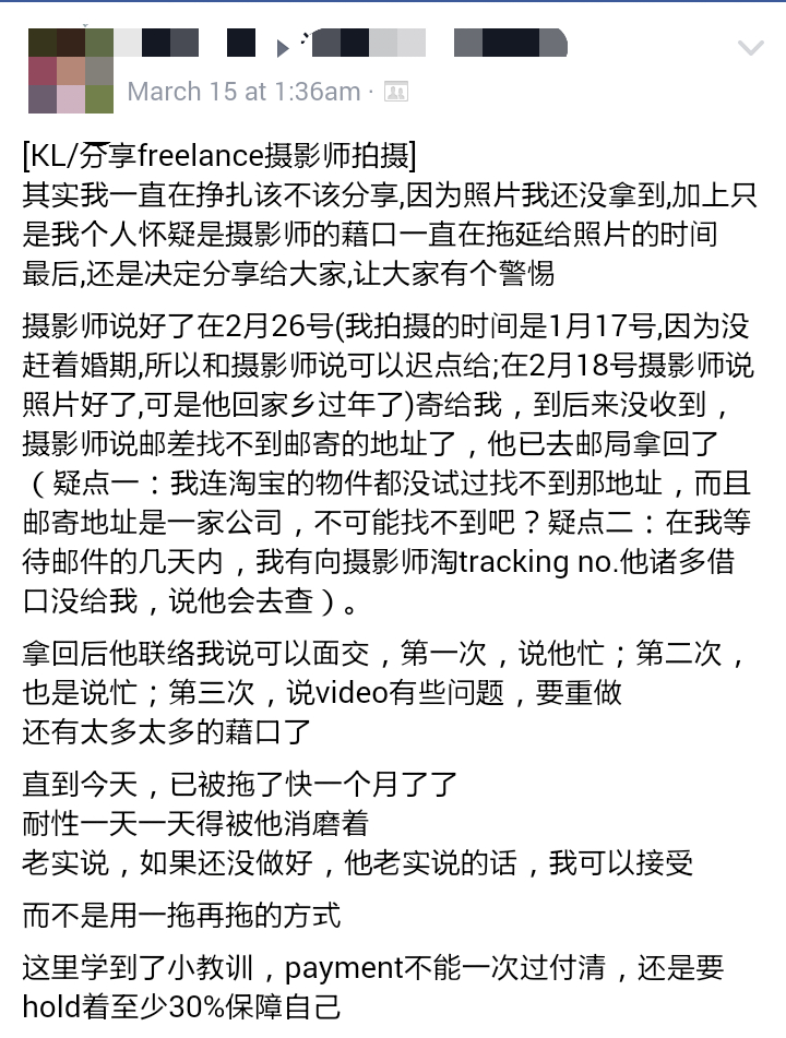 摄影师说好了在2月26号(我拍摄的时间是1月17号,因为没赶着婚期,所以和摄影师说可以迟点给;在2月18号摄影师说照片好了,可是他回家乡过年了)寄给我,到后来没收到,摄影师说邮差找不到邮寄的地址了,他已去邮局拿回了(疑点一:我连淘宝的物件都没试过找不到那地址,而且邮寄地址是一家公司,不可能找不到吧?疑点二:在我等待邮件的几天内,我有向摄影师淘tracking no.他诸多借口没给我,说他会去查)。