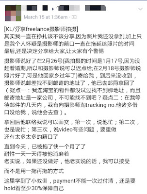 而且,当我几次都拿不到照片后,我有试过在他的面子书里,他po我的照片上留言,几分钟后,留言马上被删除