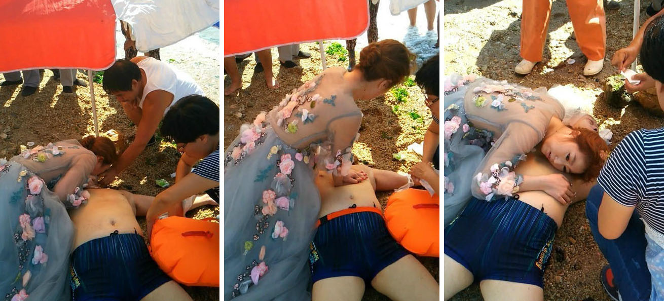 (沈阳22日综合电)中国辽宁大连市石槽风景区是当地著名的旅游地点,景色优美,因此吸引不少人到该处拍照游玩。 周一上午约10时,一名准新娘正在景区内拍摄婚照,刚巧遇到一名在游泳时突然心脏病发溺水的男子,立时跪地为其抢救,可惜该名男子最终返魂乏术。 事发时,遇溺男子被救上岸时已经没有呼吸,正在附近拍摄婚照的准新娘即上前进行心外压、人工呼吸等急救,可惜纵使她跪地抢救了20多分钟,依然未能挽回溺水男子的性命。 不过,该名准新娘的行为却感动了现场民众,而事件在网络曝光后,网民纷纷以“最美新娘”予以大赞。