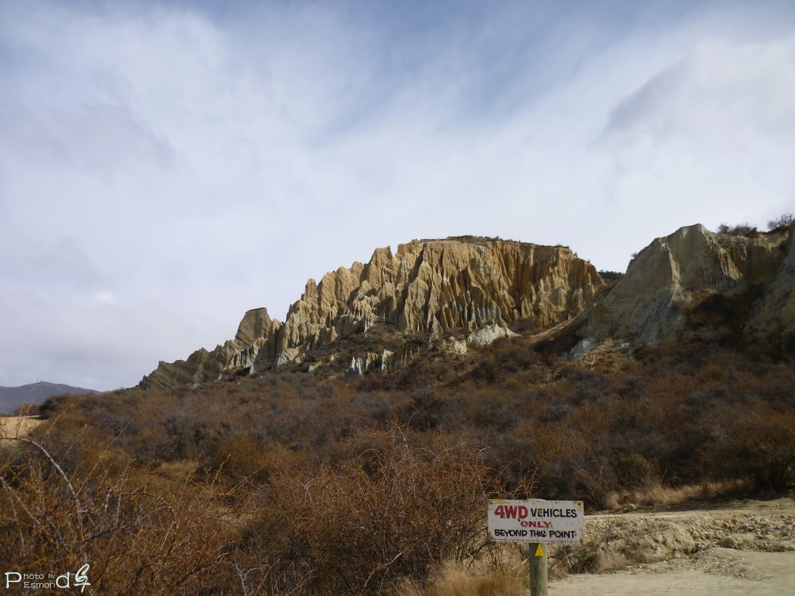 前往这个Clay Cliffs需要从主要公路转进一条小路,一条只是铺了石子的石子路,沿着石子路就会来到一个栏杆门口,上面有牌子指示这个地方属于私人地界,欲要前往的旅客都需要去到市镇内的i-Site缴付指定的入门费。。。我不知是不是纽西兰人对旅客们都那么有信心,他们真的觉得有旅客会特地去到5多公里远的市区缴付入门费???