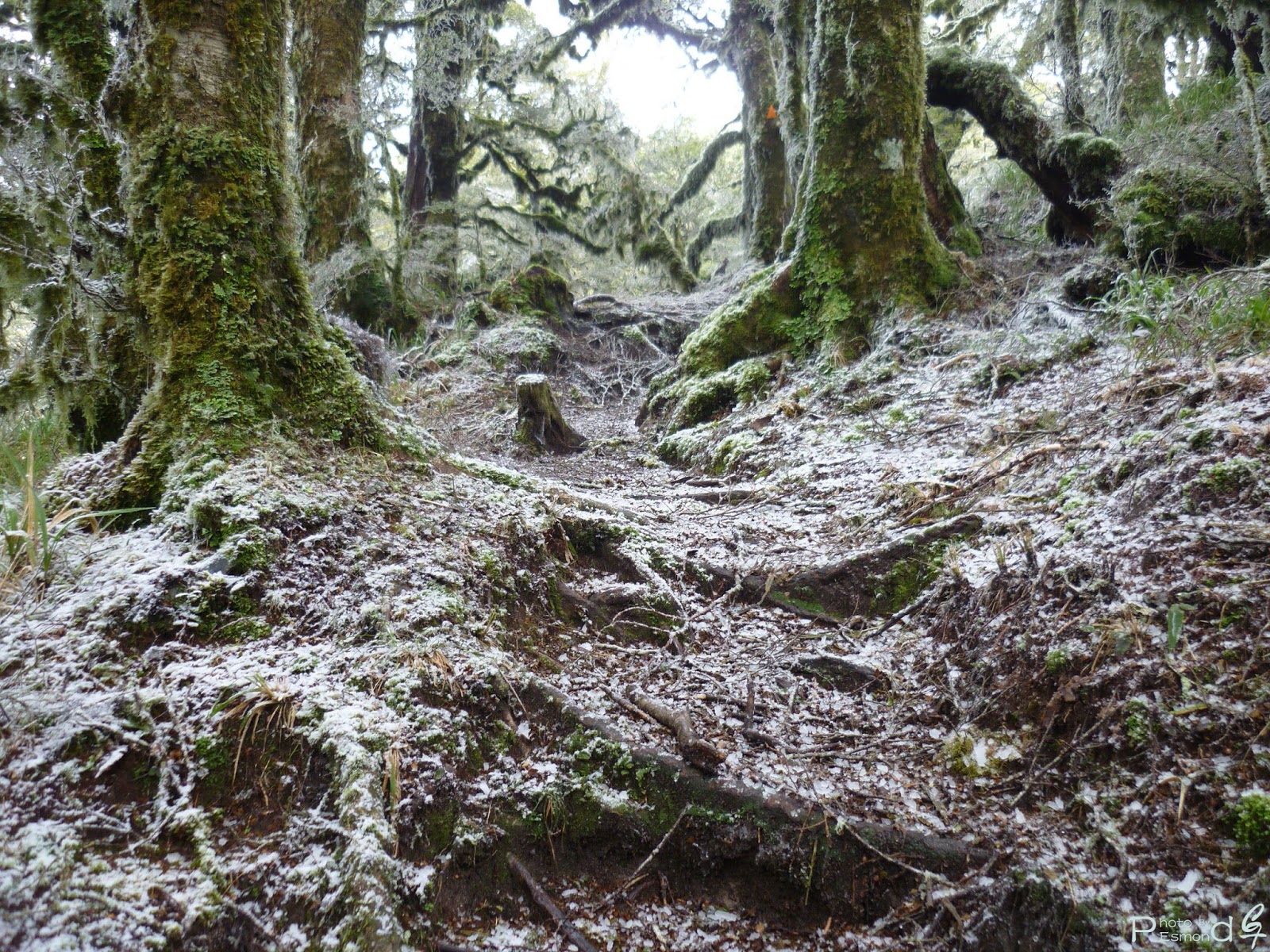 走到中午时分时,一直乌云满天的天空终于回复纽西兰最漂亮的颜色--一片蓝蓝色的天空!!!看着蓝蓝色的天空,心情顿时也好了不少。由于天气转晴,树枝上的积雪和冰就融化的更快,每当走过一片类似的树林,我就需要冒着水滴前进,就好像在雨天赶路似的。。。纳闷啊。。。